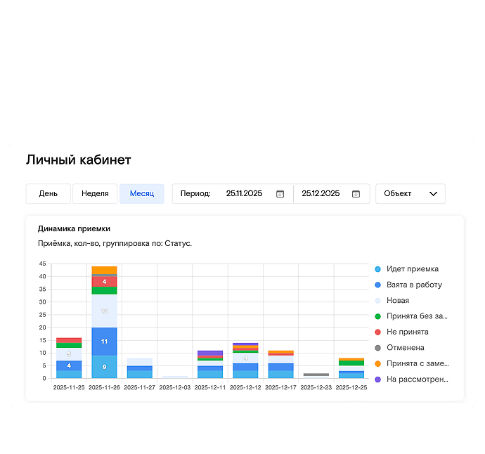 С помощью IT-разработки процесс приёмки-передачи квартир дольщикам полностью автоматизирован и переведён в электронный вид. Менеджерам компании больше не требуется обзванивать клиентов и вручную вести график: теперь они могут самостоятельно записываться на осмотр и приёмку через личный кабинет сервиса. В этом же кабинете застройщик может вести график передачи объектов — причём не только квартир, но и других помещений независимо от площади и назначения (кладовая, машино-место и т.д.).